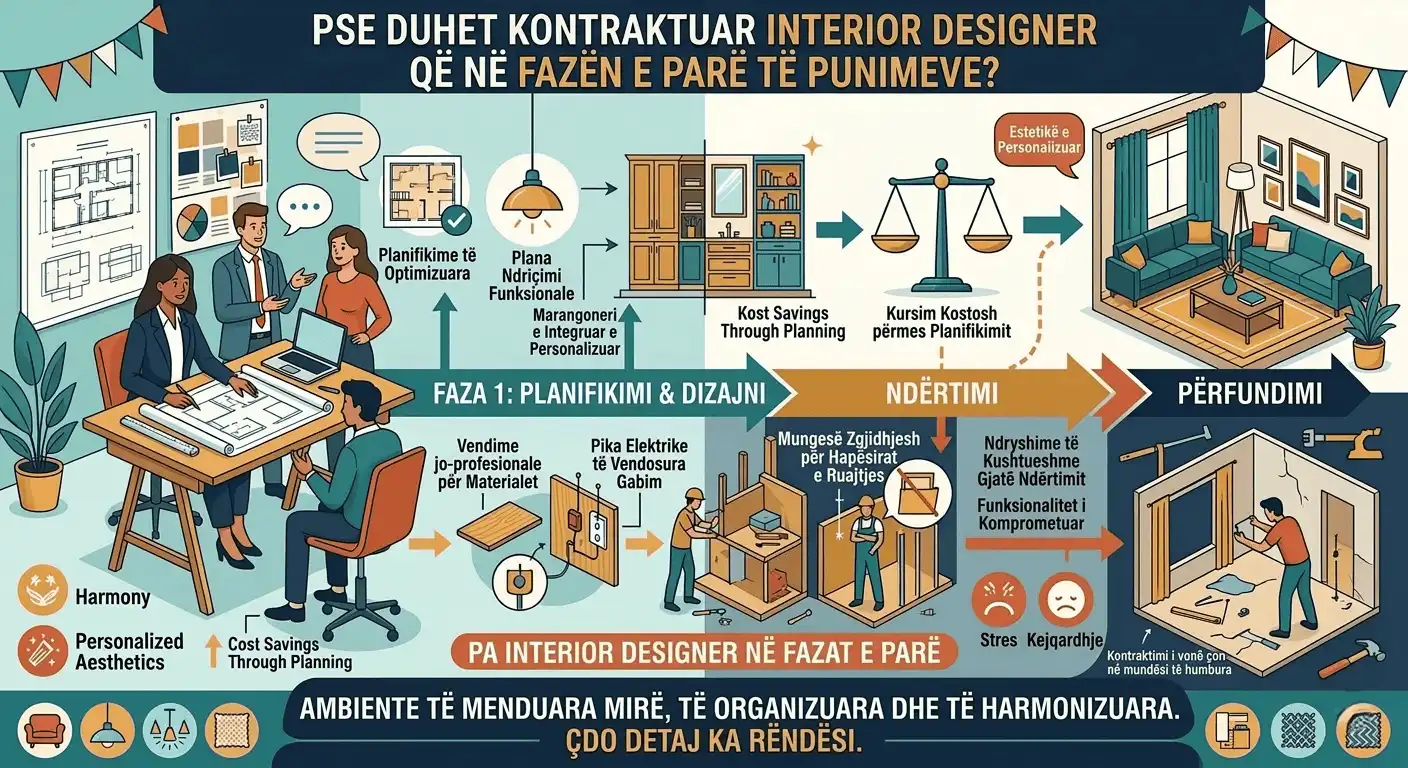 Pse duhet kontraktuar Interior Designer që në fazën e parë të punimeve Në shumë projekte ndërtimi apo rikonstruksioni, interior designer-i thirret vetëm pasi punimet kryesore kanë përfunduar ose janë drejt fundit. Kjo është një nga gabimet më të shpeshta që mund të ndikojë në funksionalitetin, estetikën dhe kostot e projektit. Kontraktimi i një Interior Designer-i që në fazën e...
